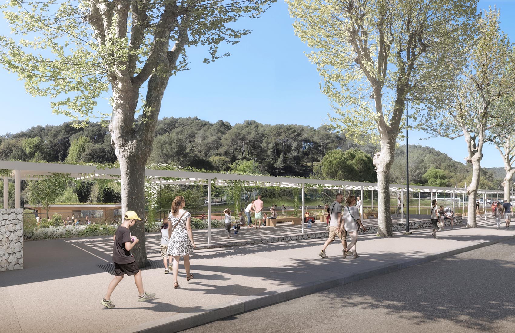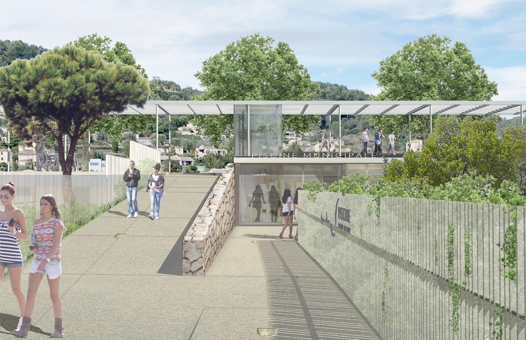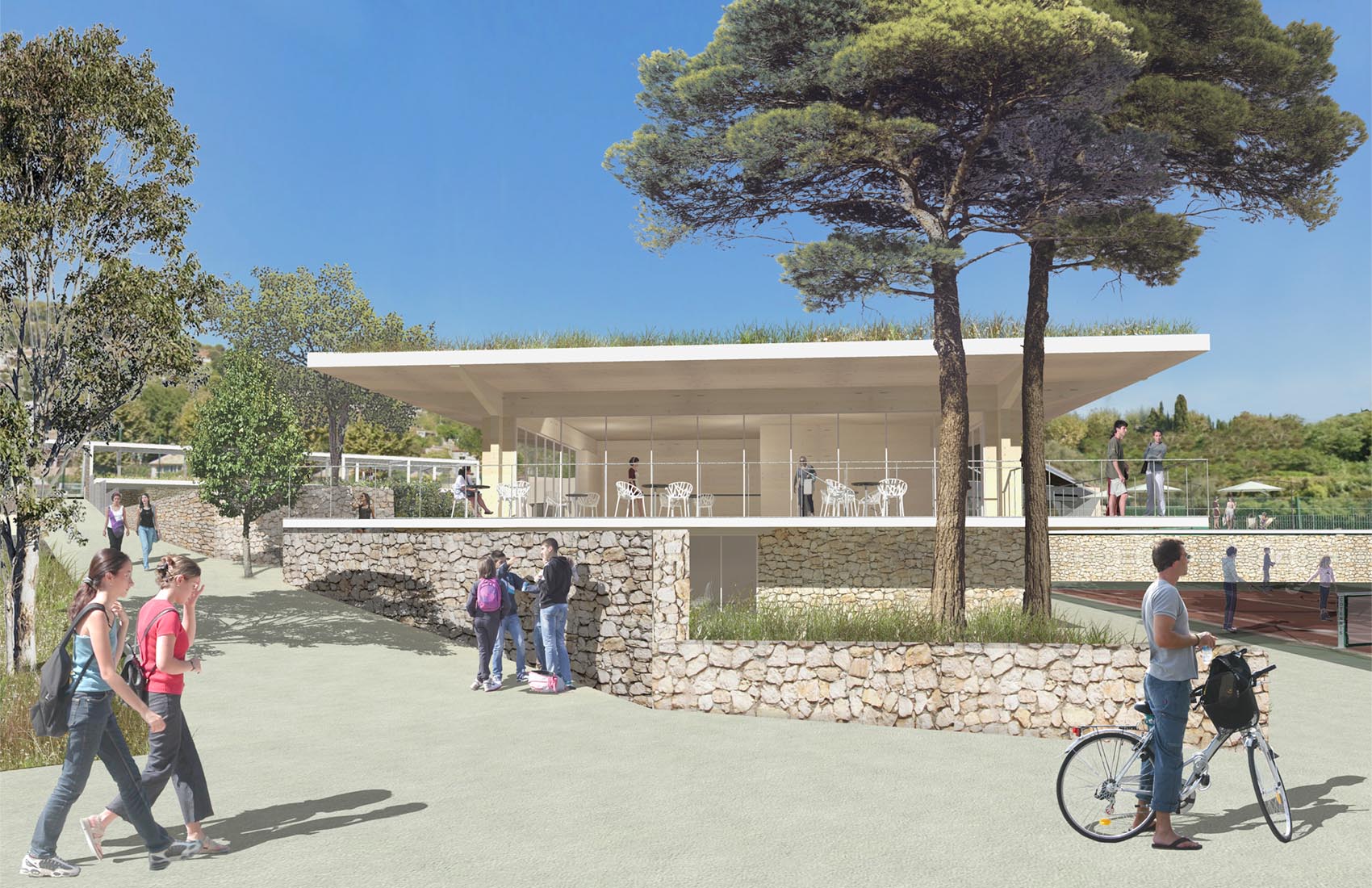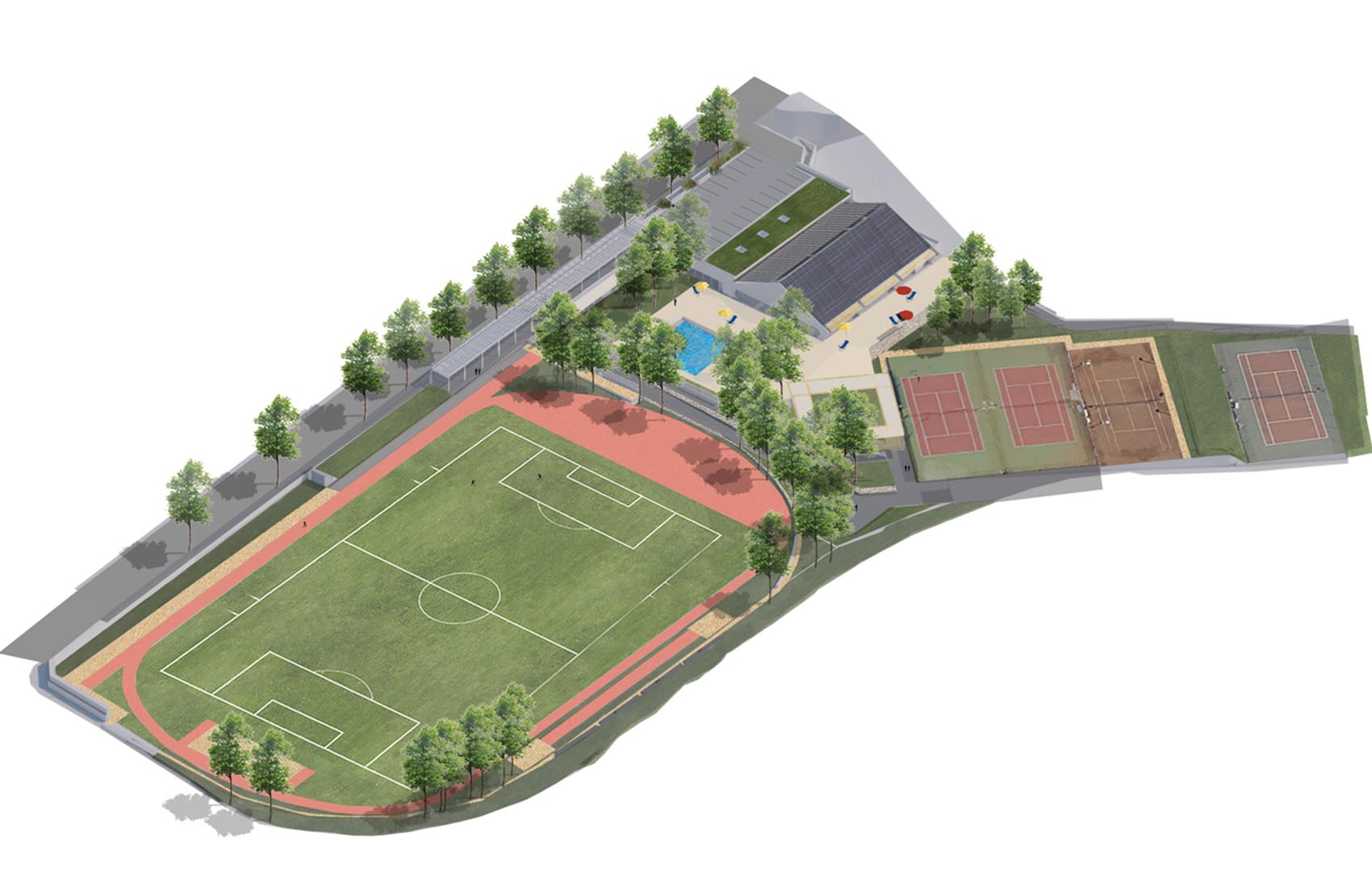 Rénovation de la piscine existante avec nouveau bassin, déconstruction des locaux tennis et création d’un nouveau Club house, mise en oeuvre d’un gazon hybride avec création de nouveaux vestiaires pour le stade de football.