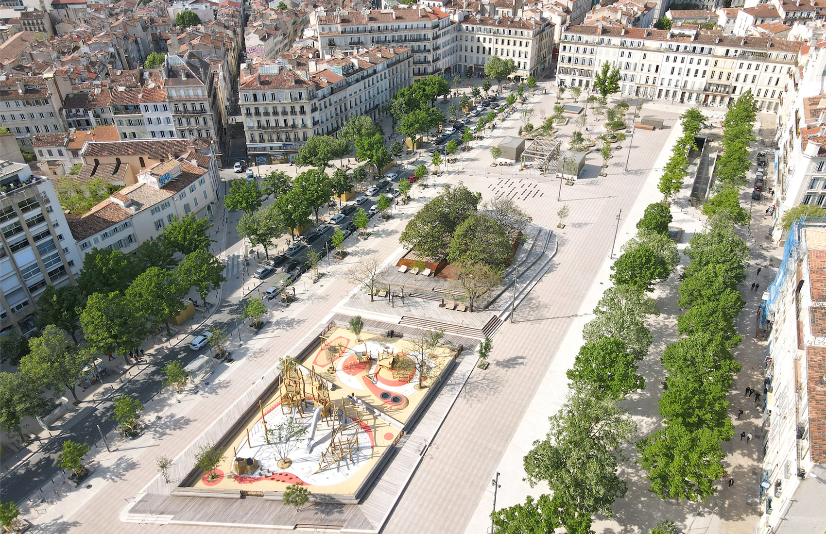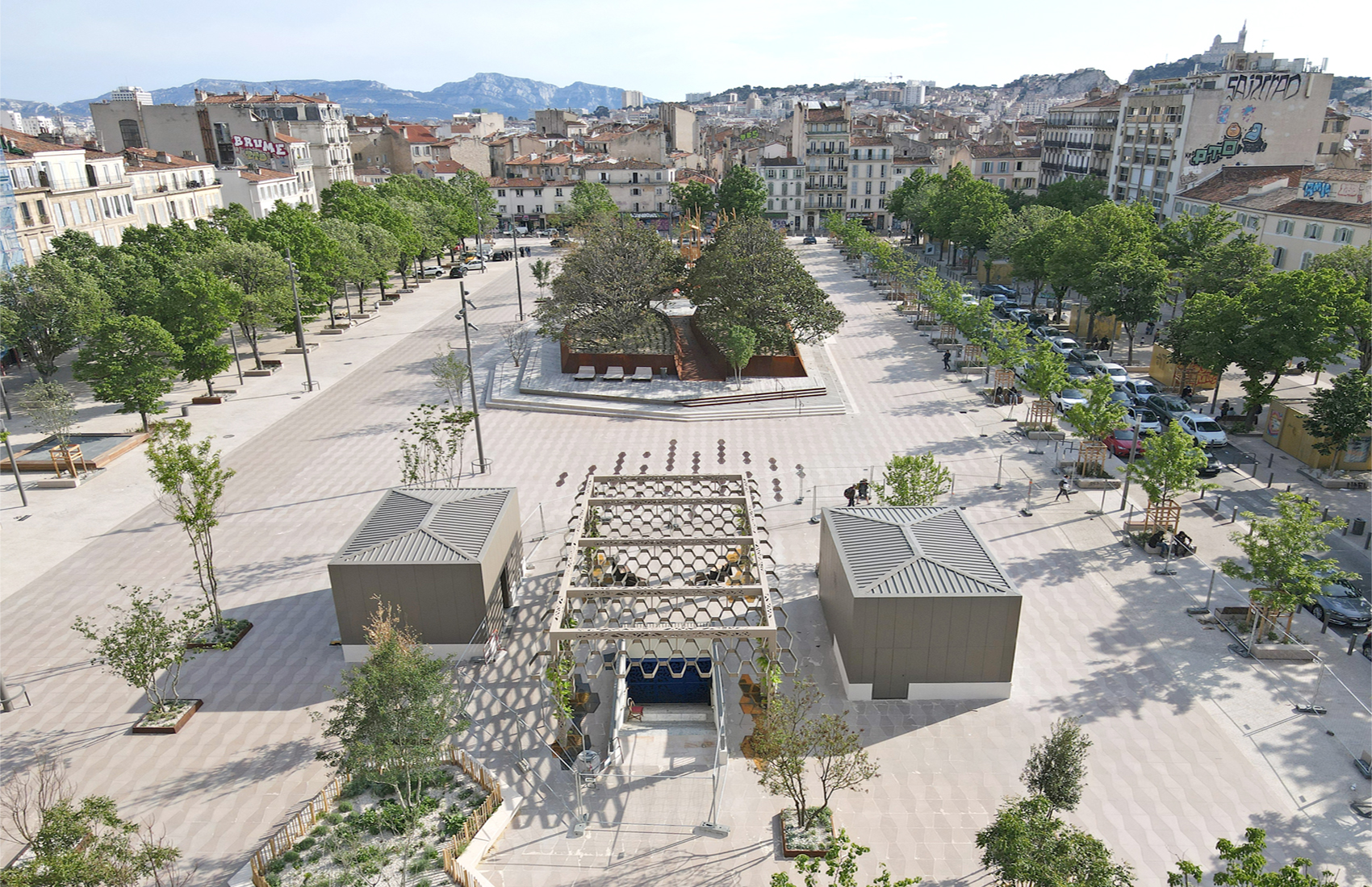 Requalification de la place existante (aménagement, construction de kiosques, ombrières)